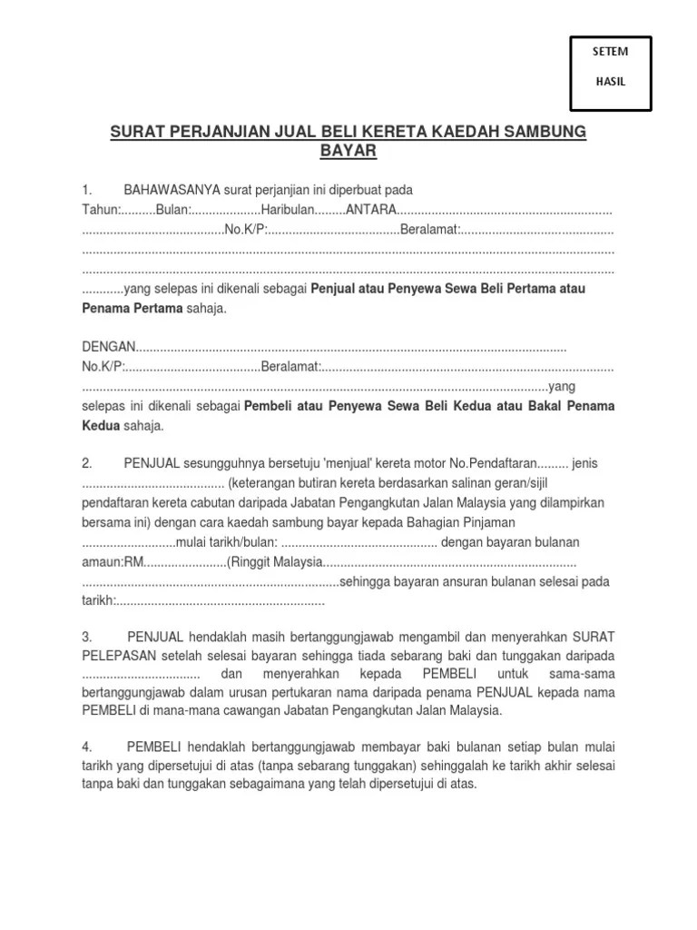 Bahawasanya surat perjanjian ini diperbuat pada tahun:.bulan:. Surat perjanjian jual beli kereta kaedah sambung bayar. Kereta yang belum habis pinjaman . Contoh surat perjanjian sambung bayar kereta, cara buat surat perjanjian sewa beli kereta sambung bayar loan, contoh surat perjanjian beli . Hasif hasan coretan peguam siri 431 repost sambung facebook. Surat perjanjian jual beli kereta kaedah sambung bayar 1.